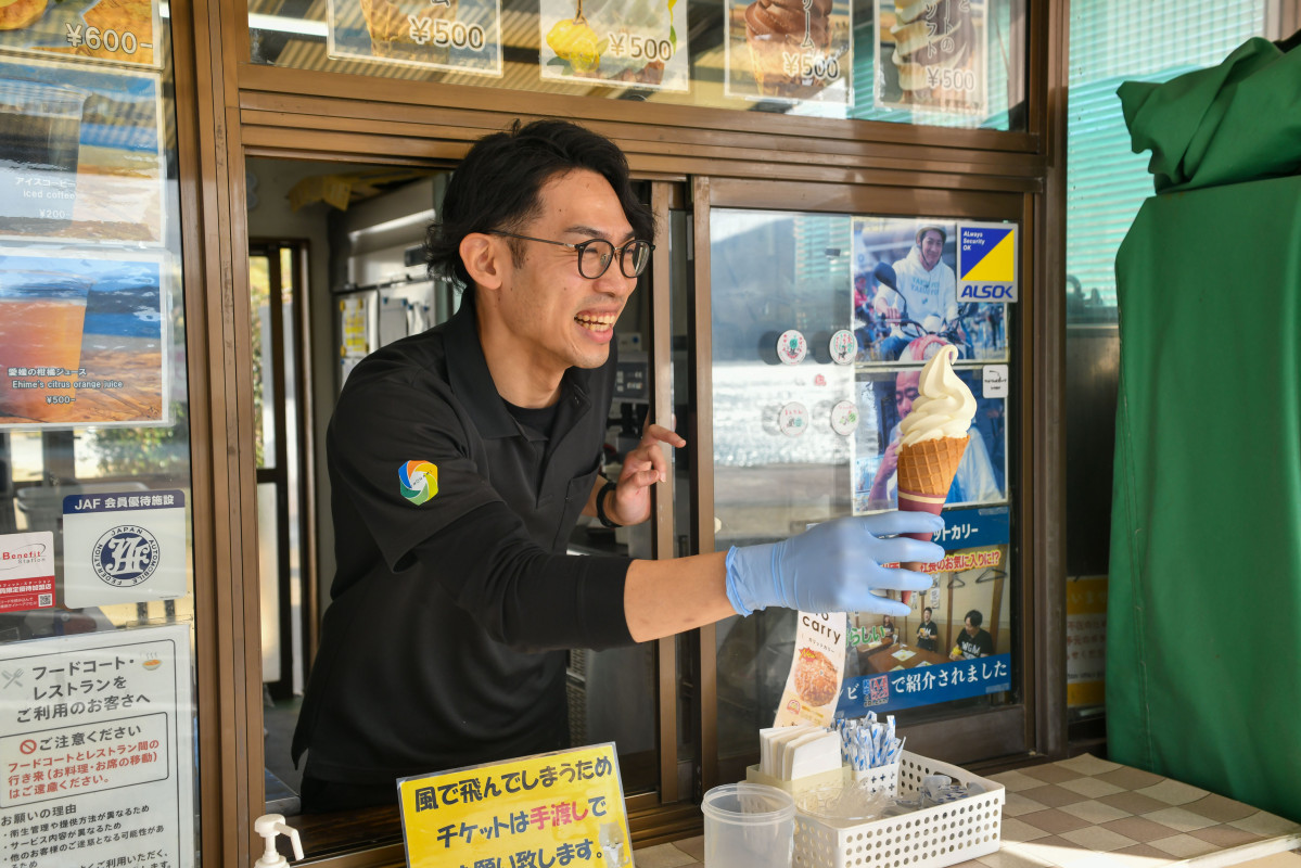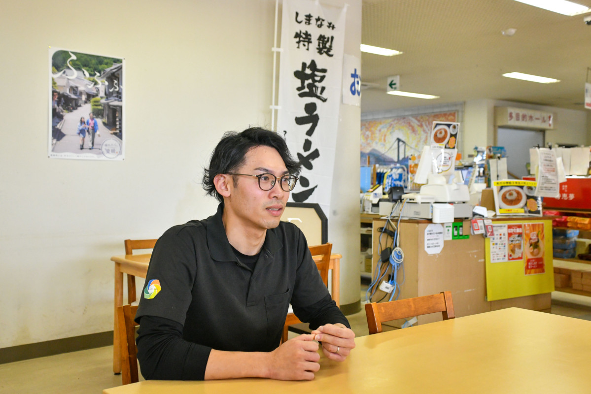 今は道の駅「伯方S・Cパーク」にいます。僕自身の役割は、ここを単なる「休憩所」ではなく「旅の目的地」にすること。長年勤めているパートさんたちの意見を聞きながら、月替わりの新メニューを考えたり、業務の効率化を進めたりしています。