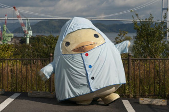 今治のご当地キャラクター「バリィさん」に10月23日、ファン手作りの雨がっぱが贈られた。