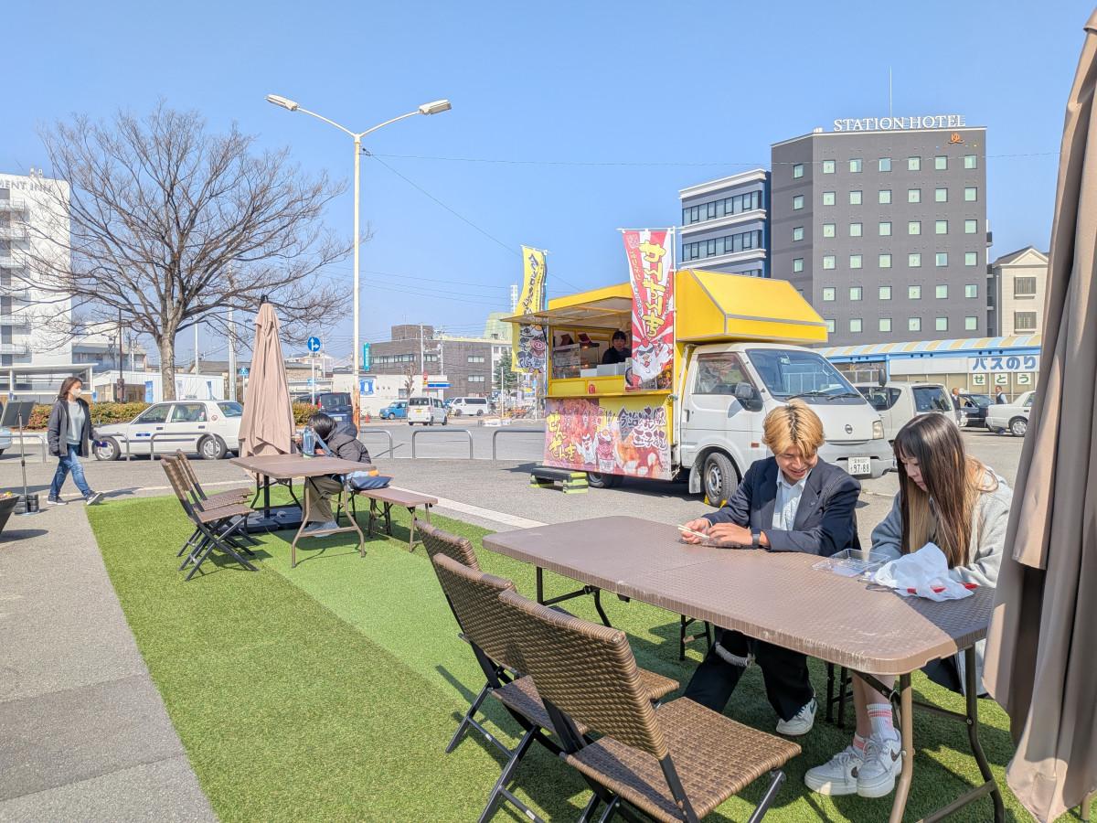 今治駅前で2月14日、駅利用者や観光客、市民が気軽に立ち寄れる空間づくりを目指す実証実験「駅前Bariショップ」が始まった。