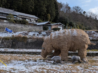 今治市で2月8日、降雪が観測され、翌9日朝にかけて市内の一部で雪が積もった。玉川町鈍川の神子之森地区に設置されている、稲わらで作られた巨大な「わらシシ」も、今シーズン初めてうっすらと雪に覆われた。