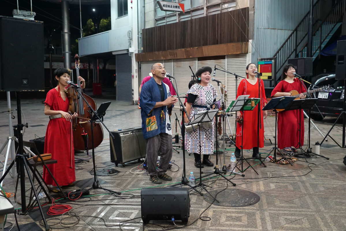 京都の五人組バンド「Colloid」や、「民謡クルセイダーズ」のフレディ塚本さん、田中克海さん、中ムラサトコさんなどによるフリーライブ。見物に来ていた子どもたちも踊り始め大いににぎわった