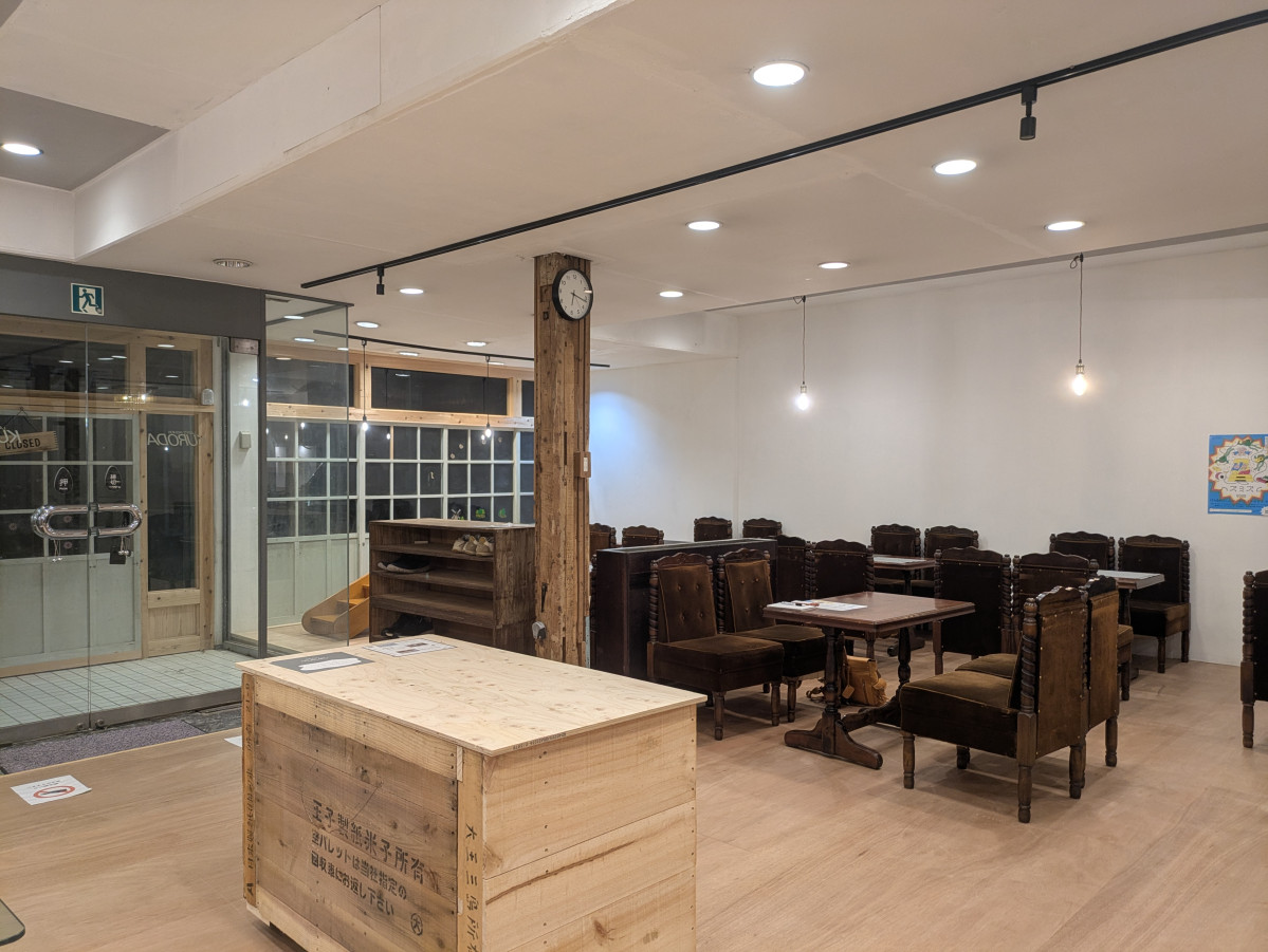 靴は脱いで上がるスタイル。食事用にテーブル席が設けられている。