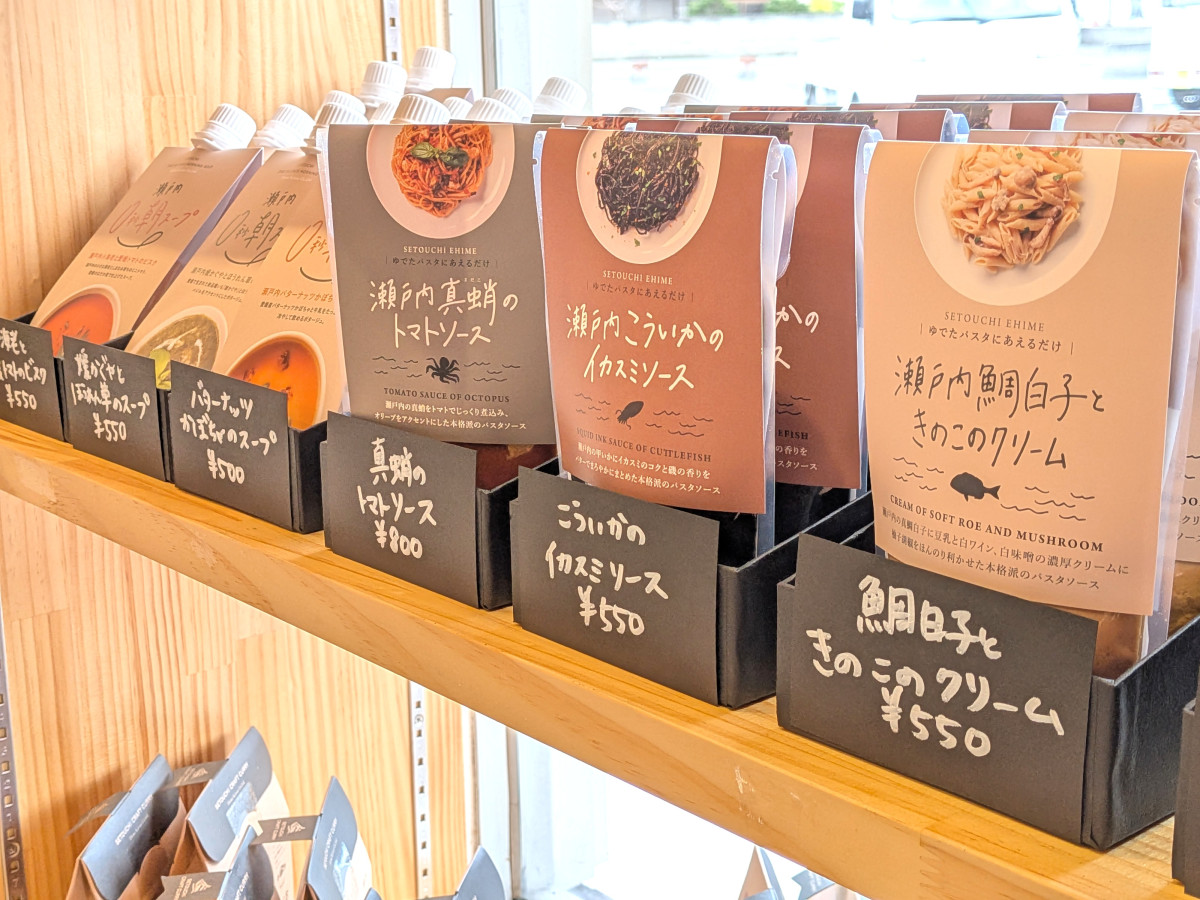 物販エリアでは、しまなみ海道、広島県、岡山県など瀬戸内エリアのかんきつ商品や食品、地酒、調味料なども販売。写真は今治に本社を置く「愛媛海産」の商品。