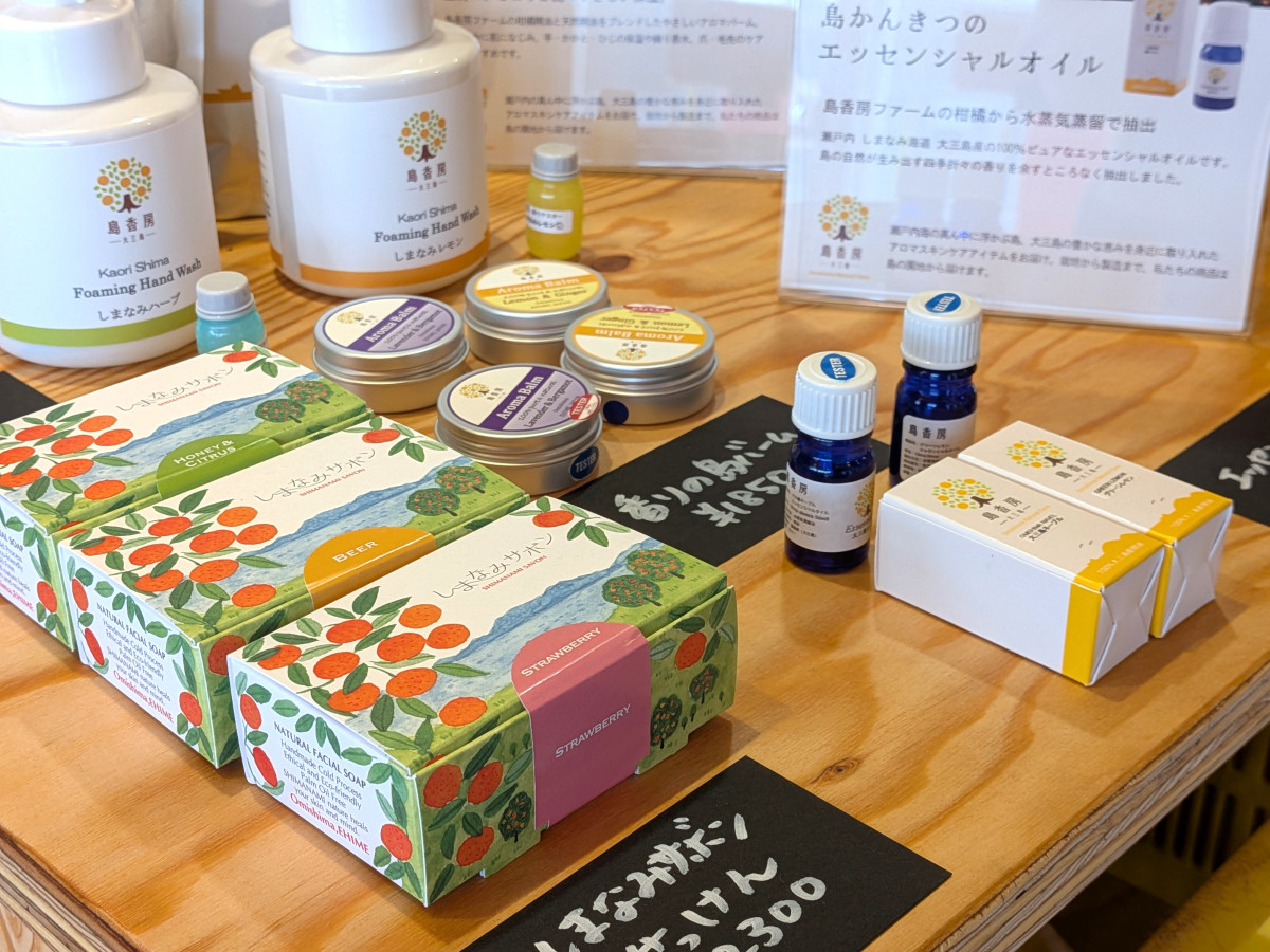 大三島でナチュラルコスメを製造・販売している「シトラス&アロマ 島香房」の商品も並ぶ。