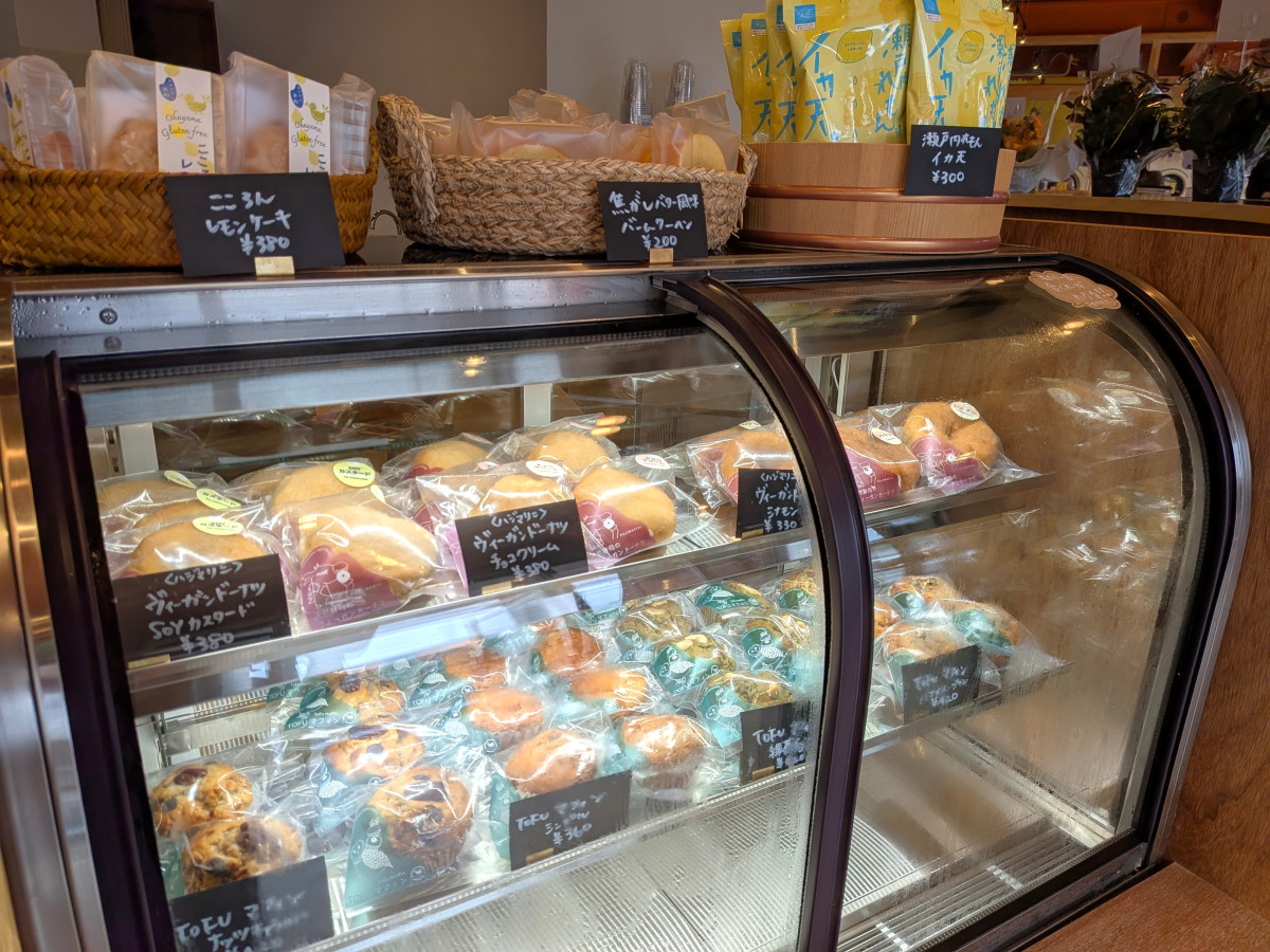 冷蔵ケースにはドーナツやマフィンなどの菓子も並ぶ。
