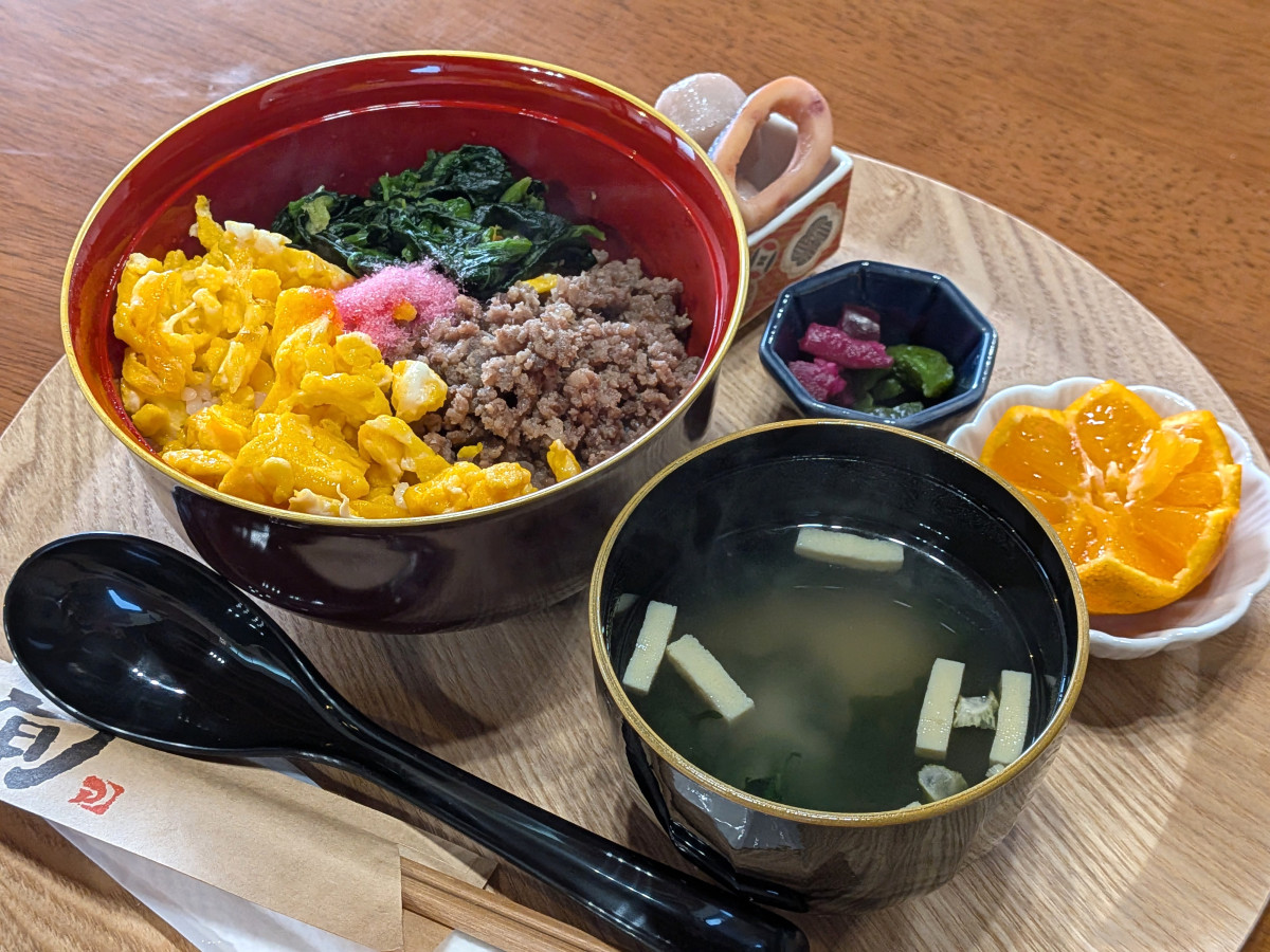 ランチメニューは日替わりで、「おにぎりランチ」「丼ランチ」「薬膳カレーランチ」などを提供する。写真は「丼ランチ」。ゆうゆカフェ(今治市長沢甲1188)にて。