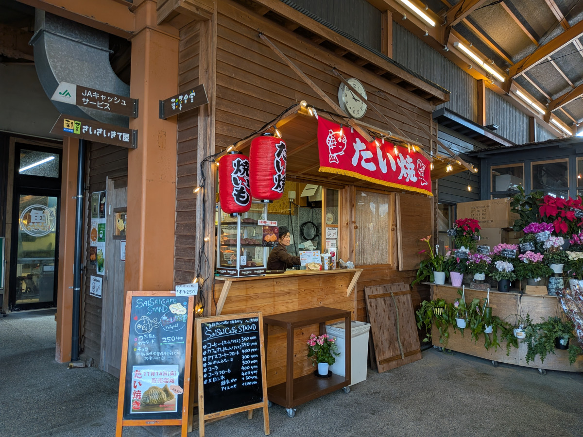スタンドは、直売所の外、花屋の横に位置。寒い季節に向けた新メニューとして「たい焼き」の販売を開始した。SAISAICAFE STAND(今治市中寺279-1)。