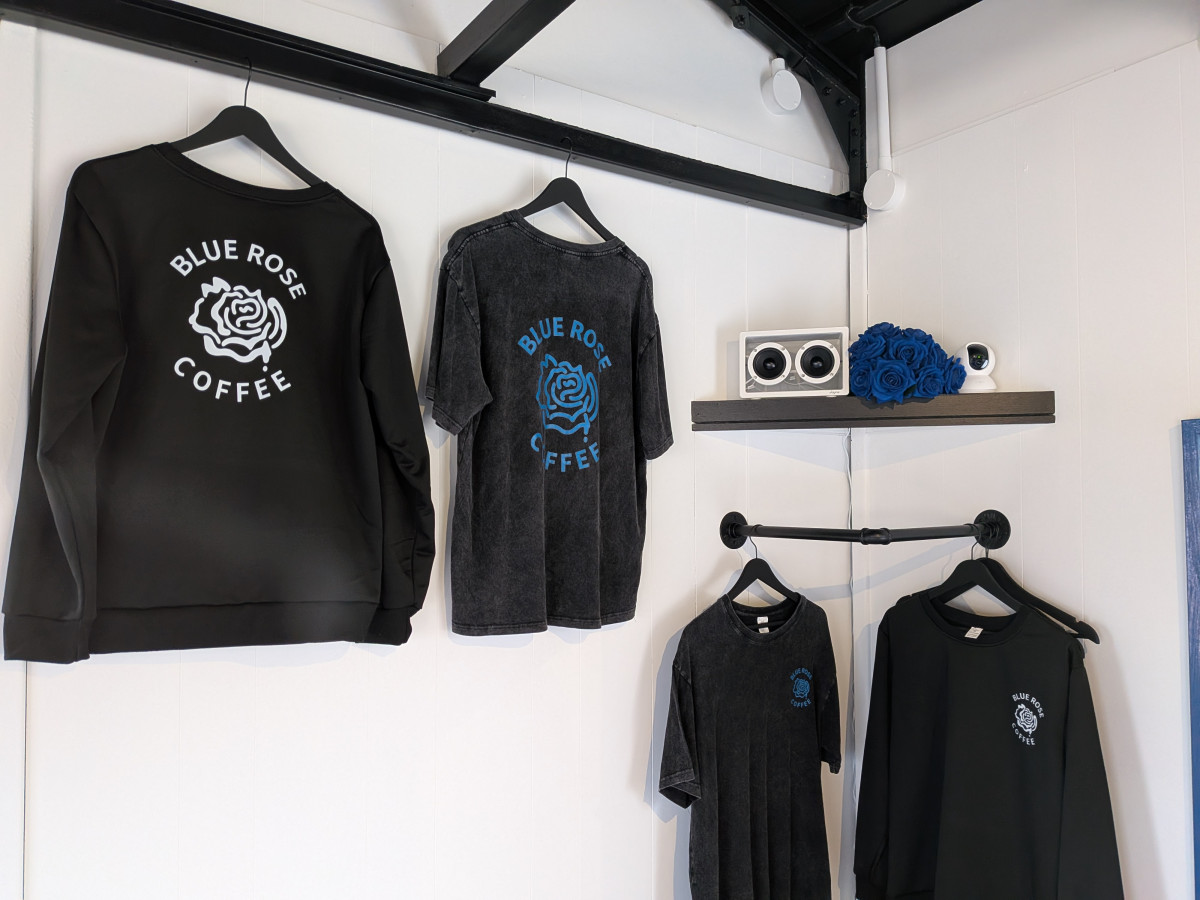 ブルーローズコーヒーのロゴがデザインされたアパレルやグッズも、今後展開していきたいと意気込む。