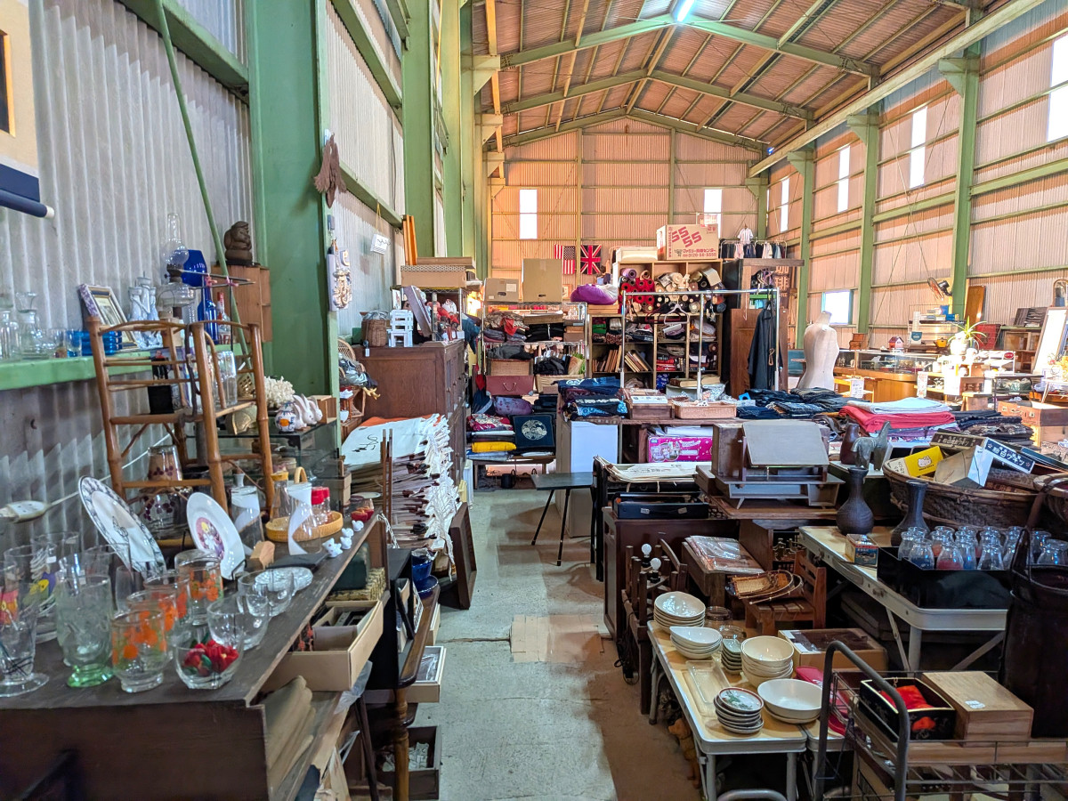 当日は古物や雑貨、アンティーク食器などを扱う12店舗が出店する。八幡倉庫(今治市玉川町八幡甲400)