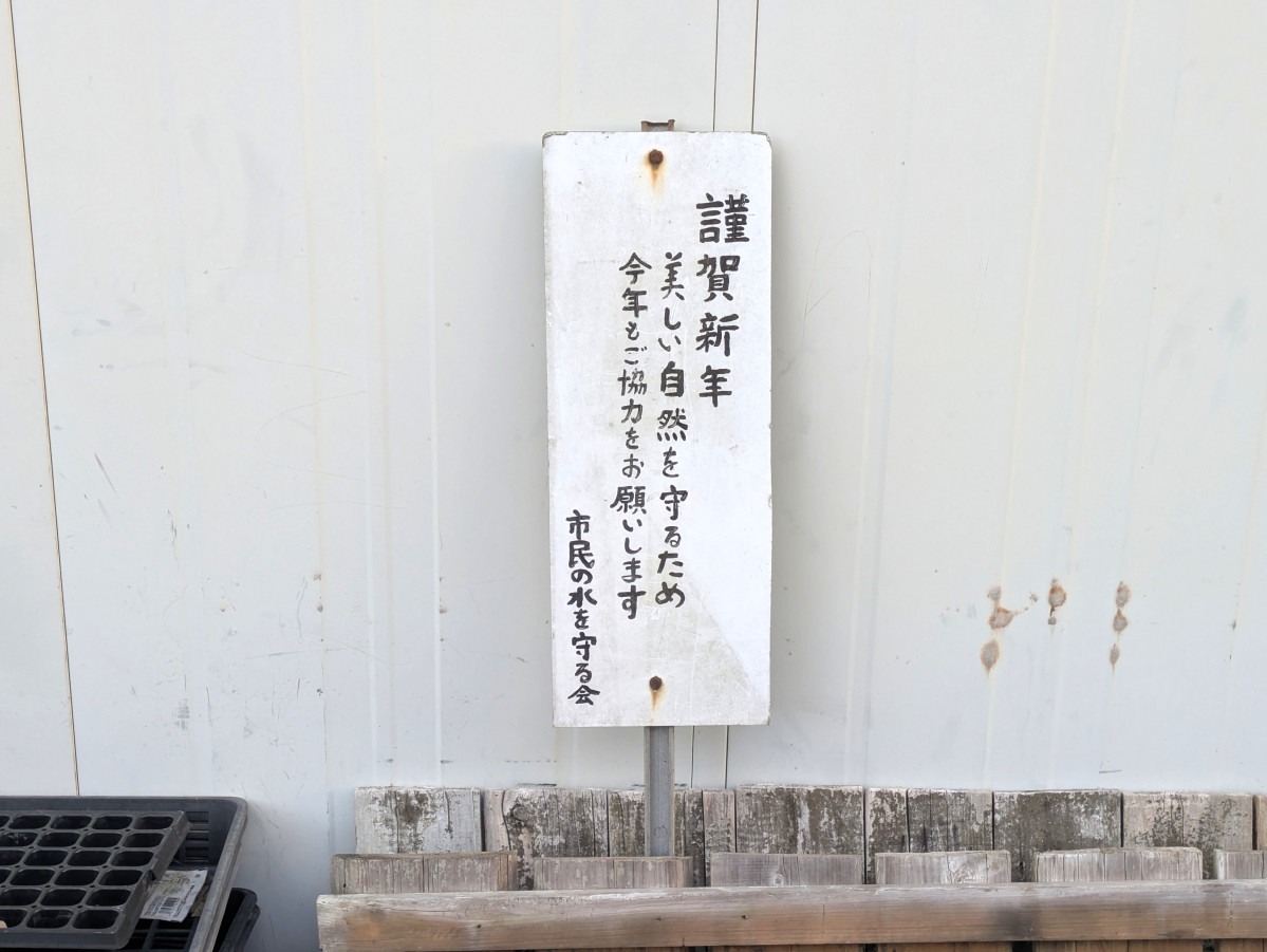 新年を迎えた今治市玉川町の道端に、手作りの「謹賀新年」の札が立てられている。