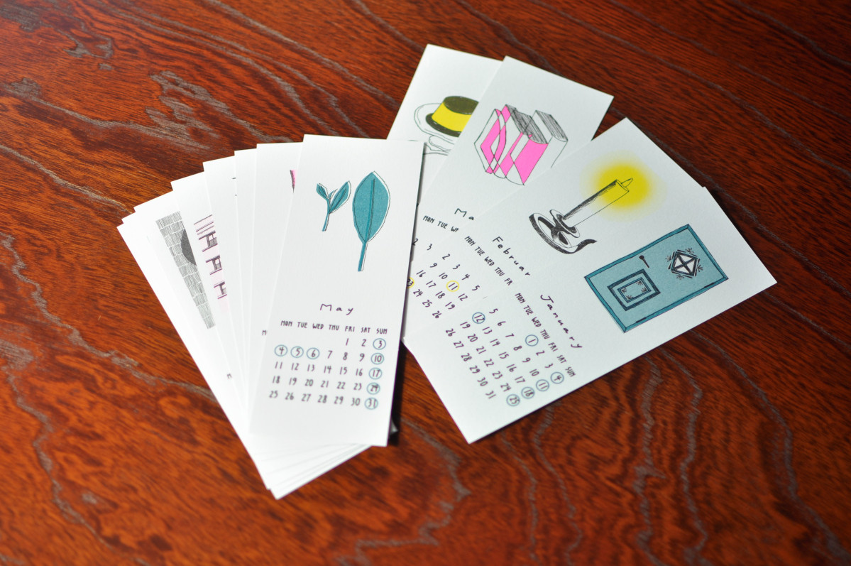 今回制作したカレンダー。「なくなっていくもの・巡っていくもの」をテーマとした12の絵が施されており、今回はこの原画が展示されている。古本カフェ森(今治市米屋町4-2-1)