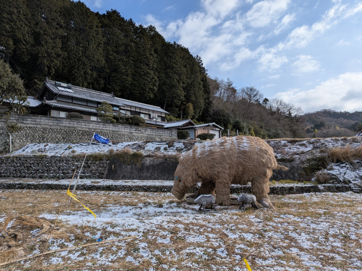 今治市玉川町鈍川神子森の県道沿い、越智要さんの田んぼに設置されている「わらシシ」。今シーズン初めての雪化粧。わらシシ(今治市玉川町鈍川戊616)