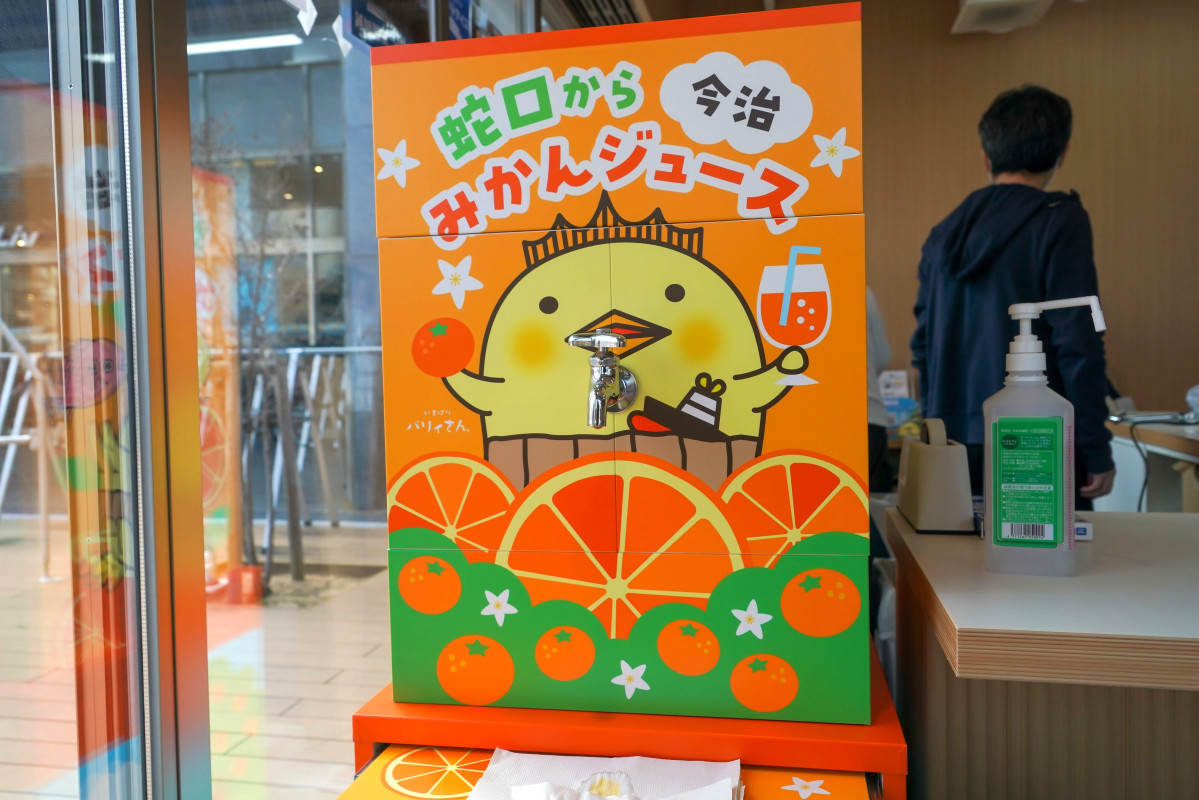 蛇口からミカンジュースも楽しめる。今治駅前観光インフォメーションセンター(今治市北宝来町2丁目)