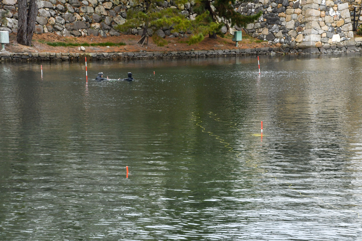 「今治城の堀にダイバーが入っている」――2月7日、城を訪れた市民が足を止める光景が広がった。