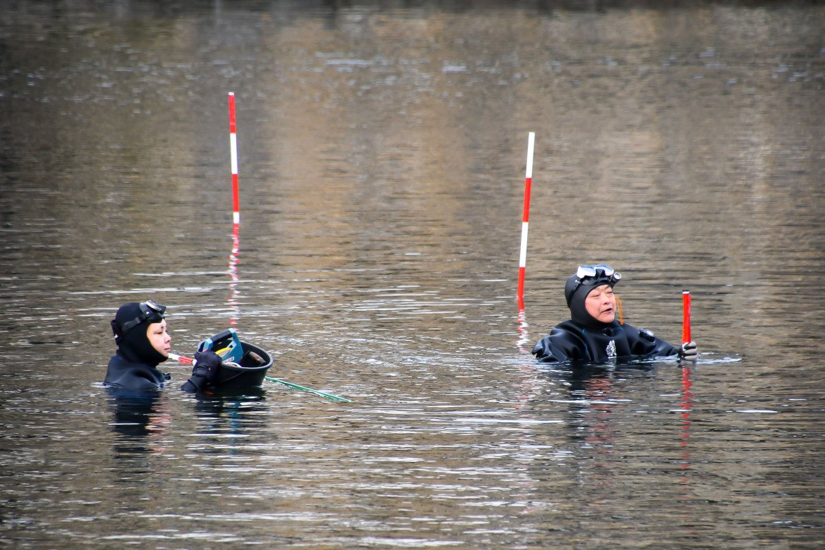 「今治城の堀にダイバーが入っている」――2月7日、城を訪れた市民が足を止める光景が広がった。