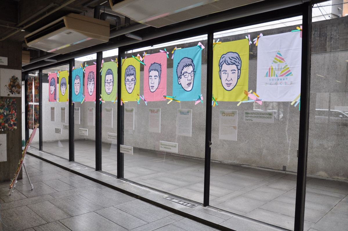 作品それぞれに説明がない代わりに、今回制作を手がけた利用者を大きく紹介。ポップなイラストが目を引く。今治市民会館(今治市別宮町1-4-1)