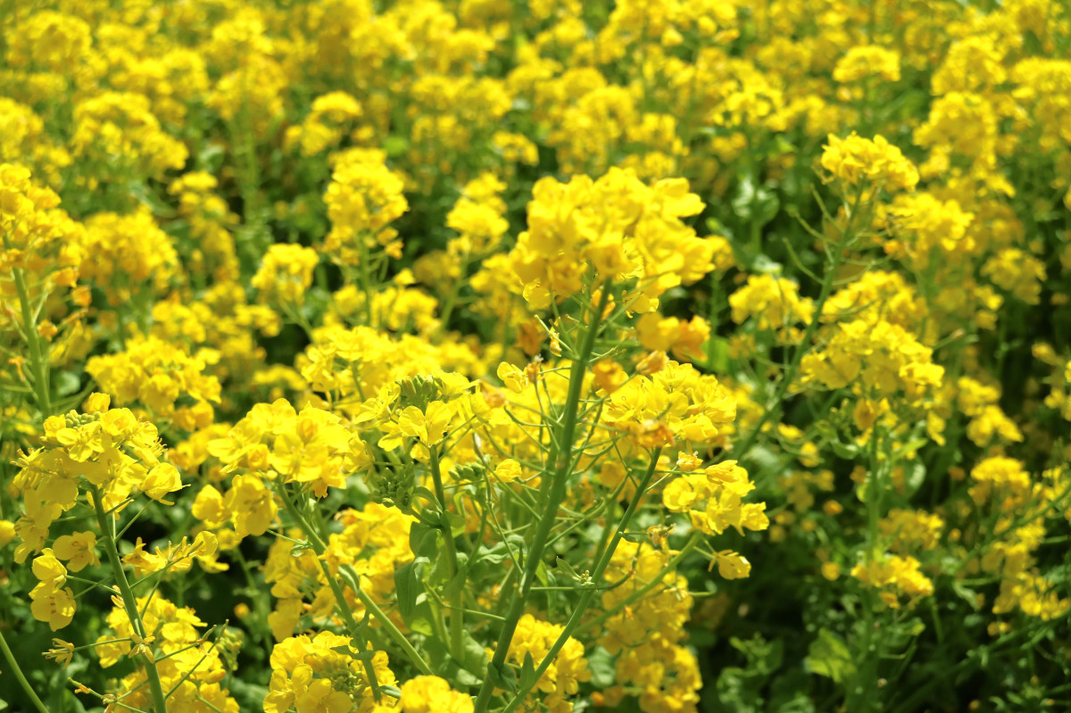 今治市大西町脇集落の田んぼの「菜の花」が見頃を迎え、一面に広がる黄色の花が道行く人の目を楽しませている。