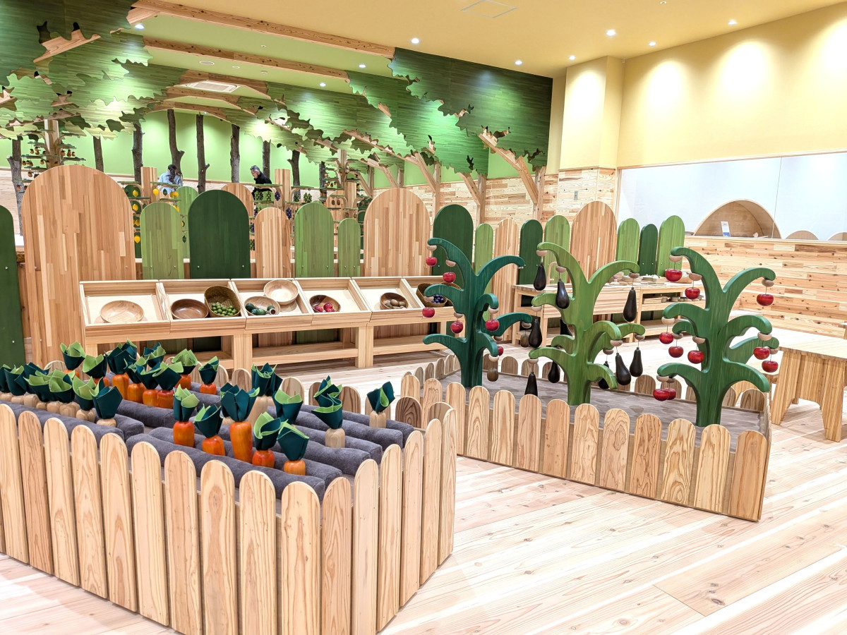 収穫遊びが楽しめるエリア。畑に植わっている野菜を抜いたり、枝にぶら下がっているナスやトマトをもいだりして、ごっこ遊びも楽しめる。しまなみ木のおもちゃ美術館(今治市にぎわい広場1-1 イオンモール今治新都市 1階)