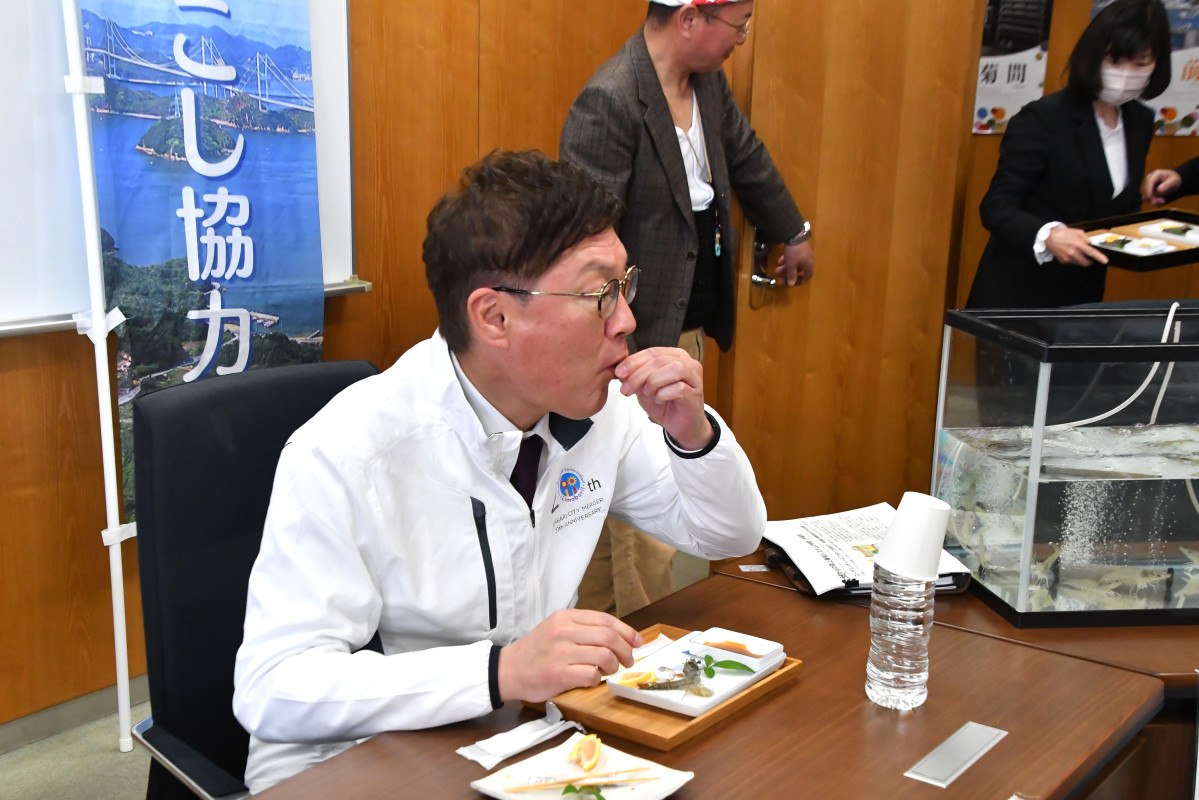 試食した徳永繁樹今治市長や関係者からは「とにかく味が濃い」「プリプリした歯ごたえが、これまでのエビと全く違う」と絶賛の声が上がった。