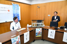 今治市役所でエビの「陸上養殖」成果報告の様子